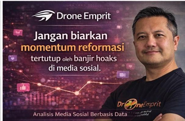 Lembaga pemantau percakapan media sosial Drone Emprit menyoroti maraknya hoaks dan disinformasi yang beredar di ruang digital dan dinilai memiliki kecenderungan sistematis dalam membentuk persepsi negatif terhadap institusi Kepolisian Negara Republik Indonesia. Fenomena ini muncul bersamaan dengan bergulirnya momentum reformasi Polri yang seharusnya menjadi ruang bagi diskursus publik yang sehat, berbasis data, dan konstruktif.
